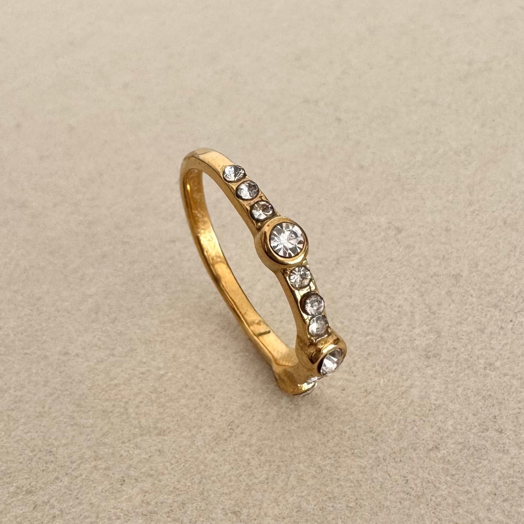-Round ring with small zircons all around and three larger zircons standing out.