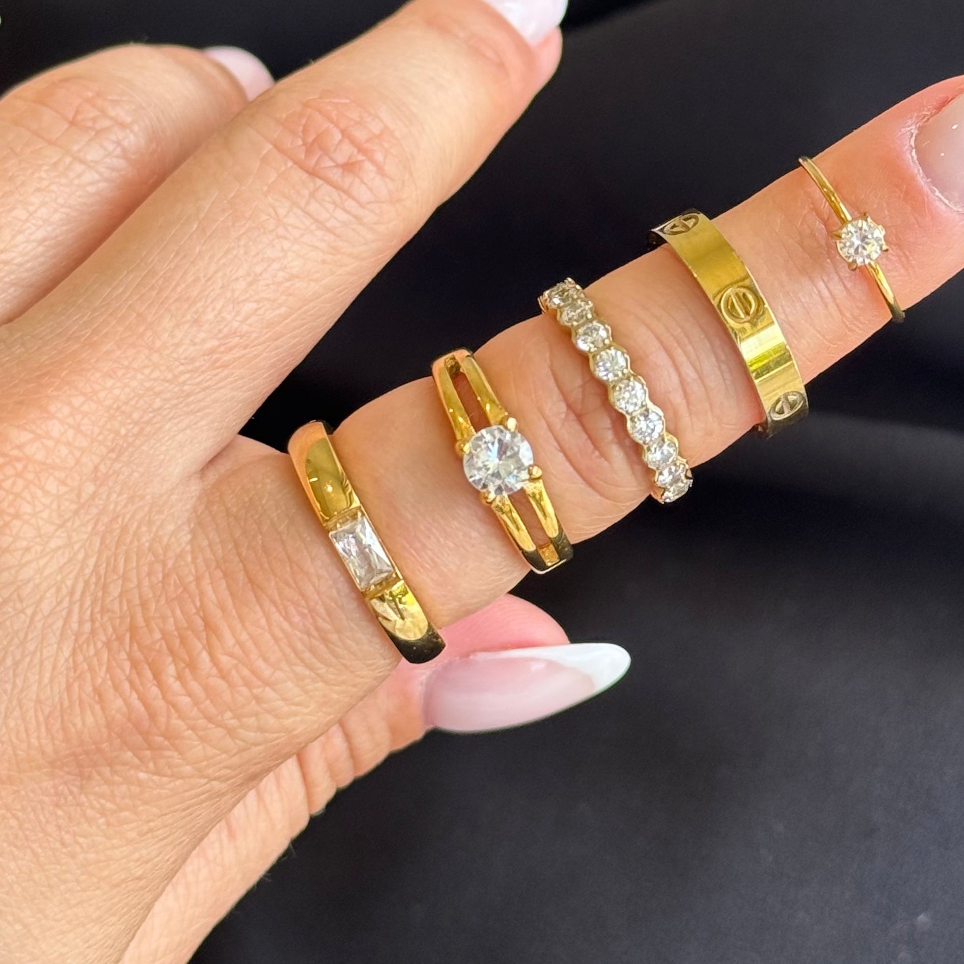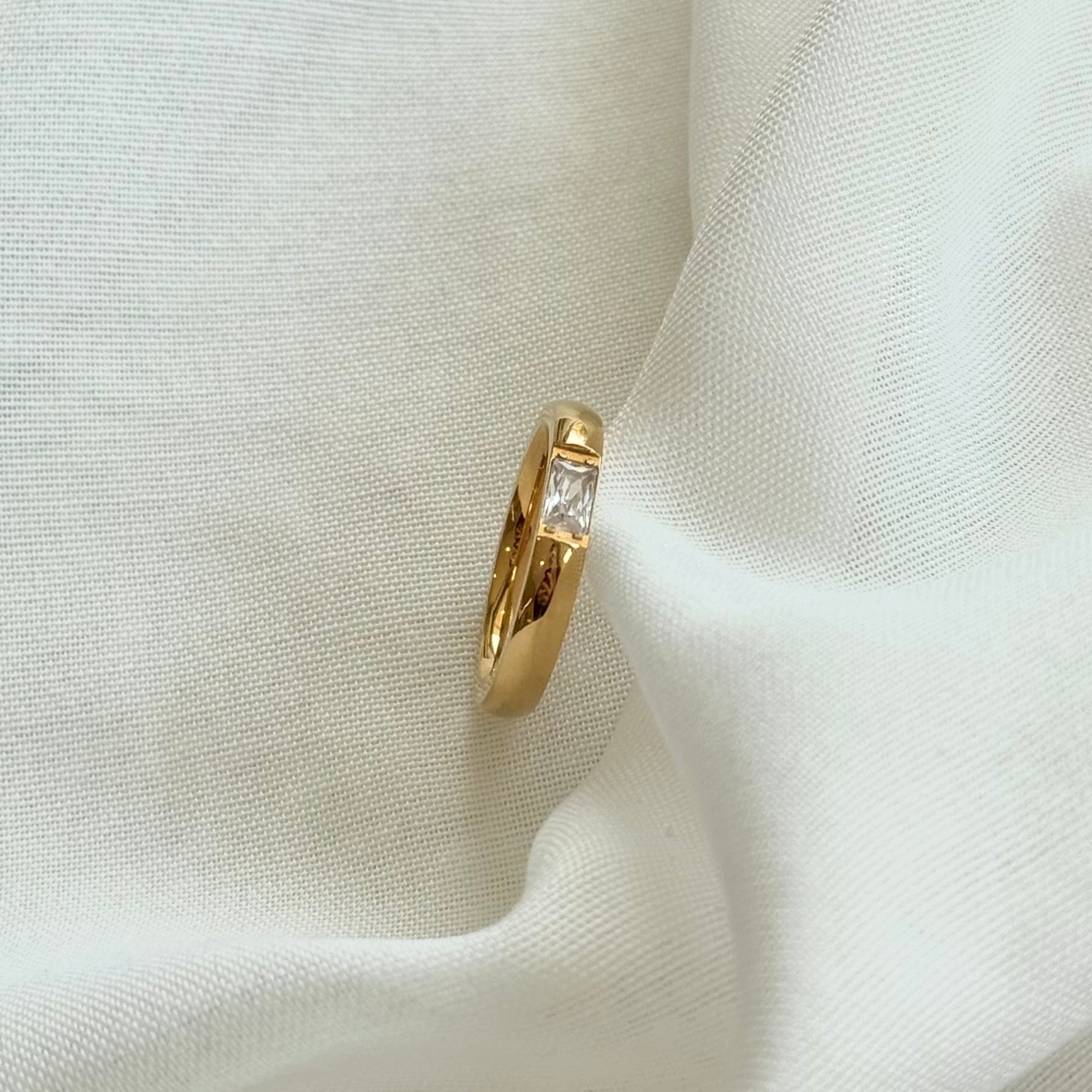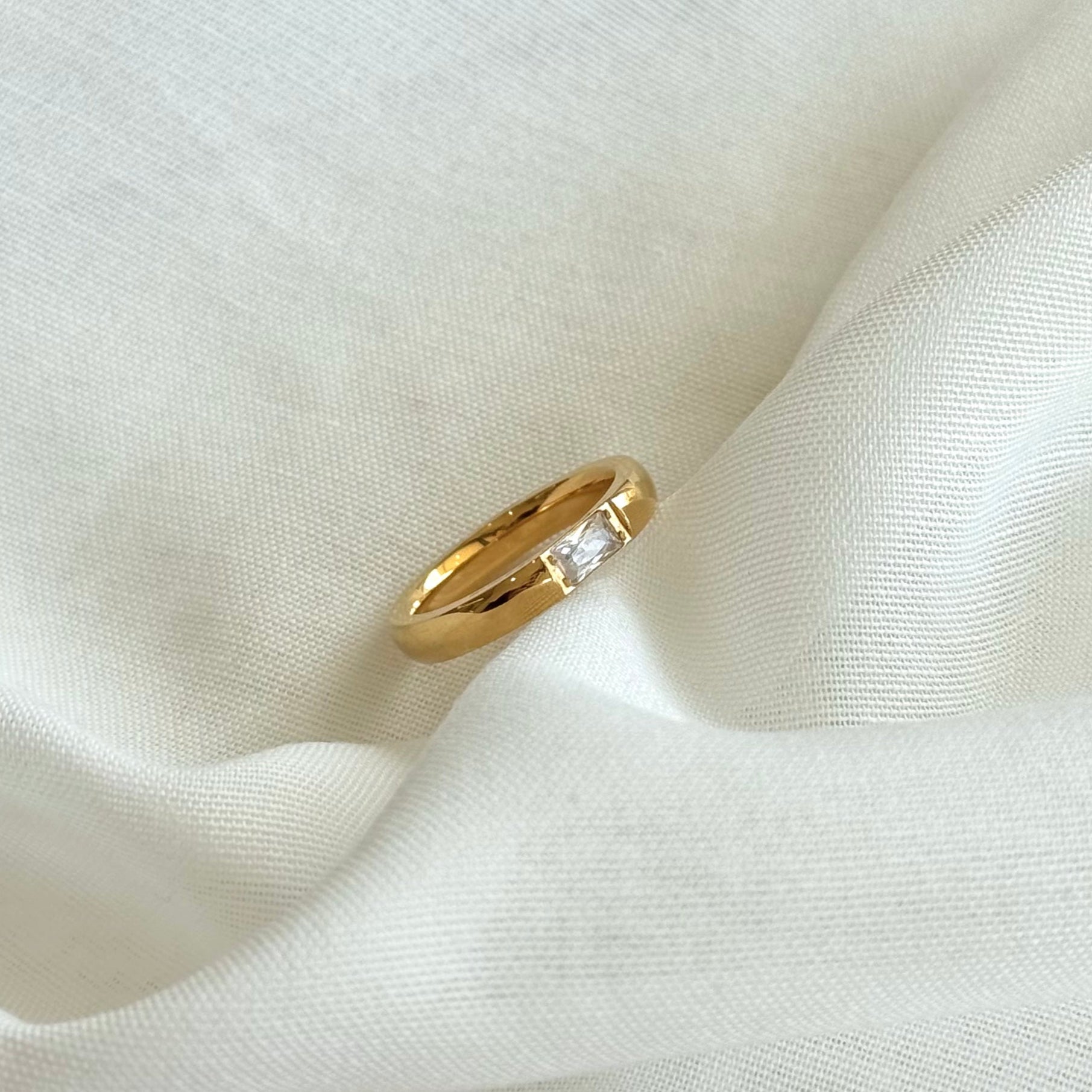 -Ring with thin band, smooth polished finish, features a zirconia in the center.