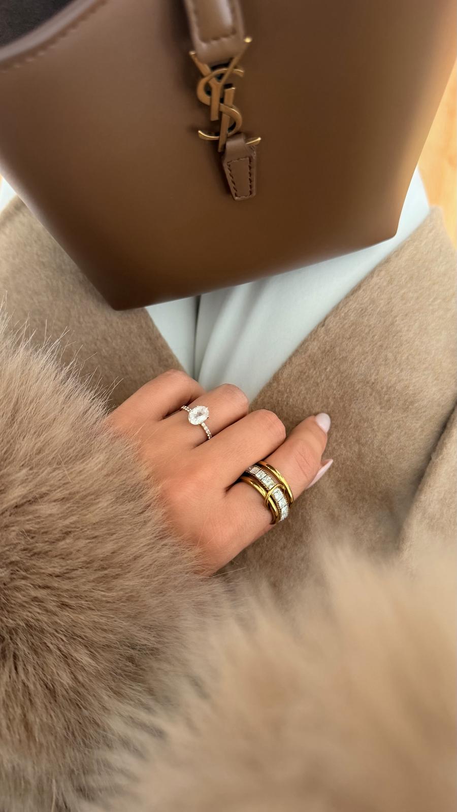 Anel com efeito triplo, composto por 2 anéis dourados polidos e um com zicornias quadrangulares , unidos por 2 pequenas argolas. O anel descrito é o anel do dedo indicador na foto.