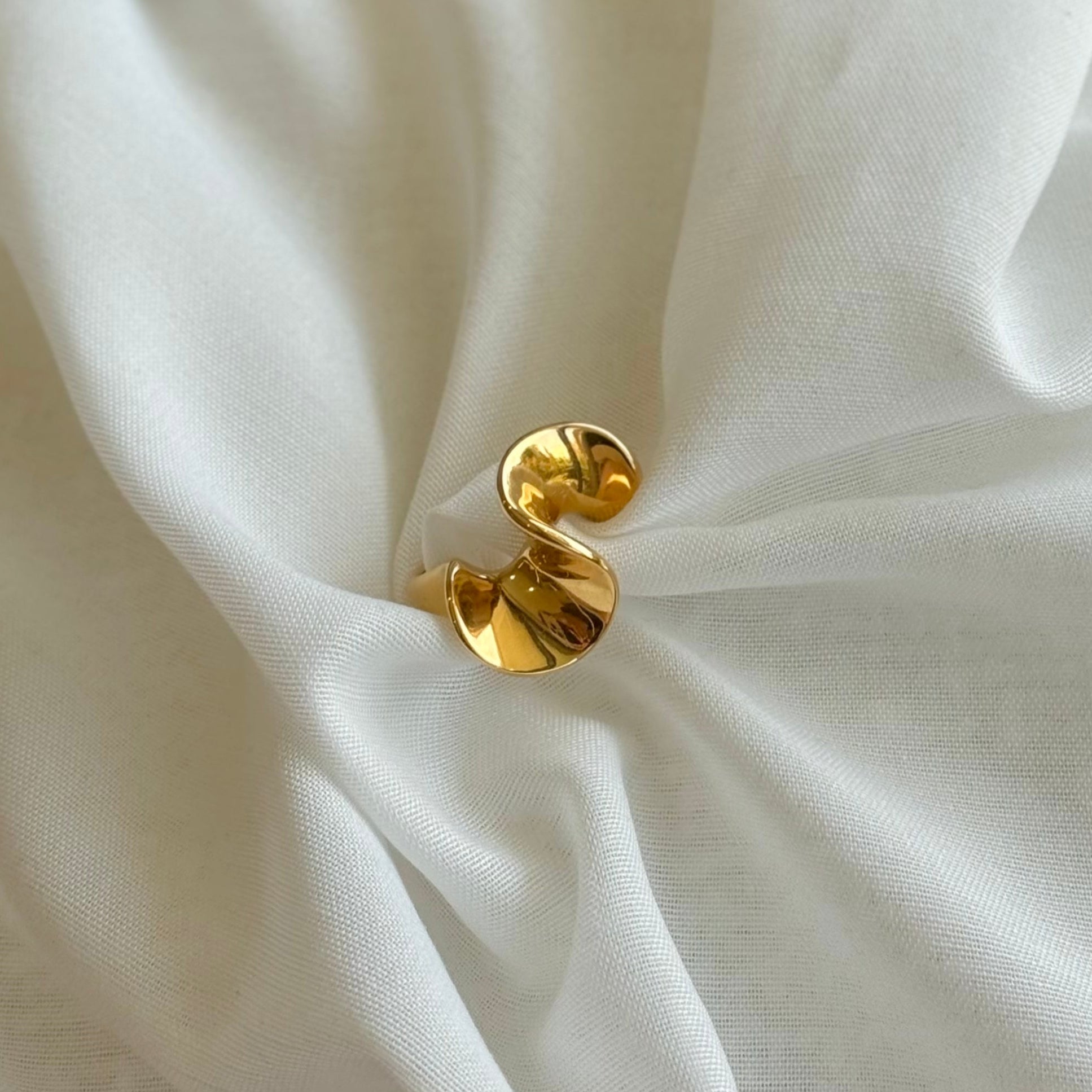 -Ring with "S" type spiral movement design. Voluminous and striking ring, with a polished and shiny finish.