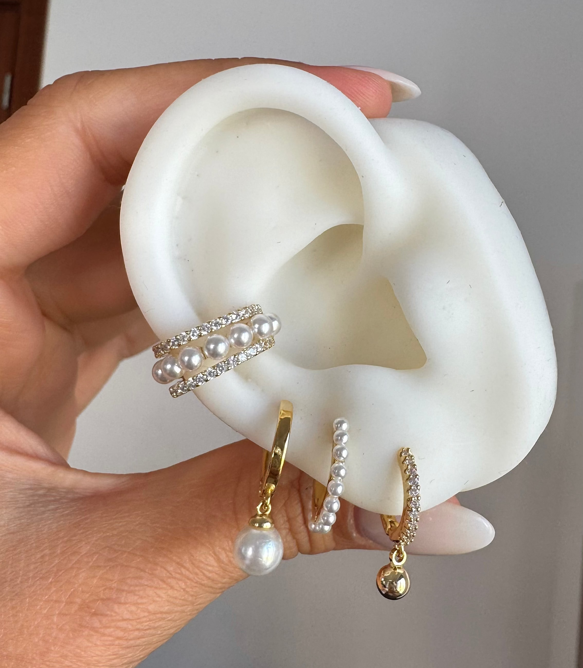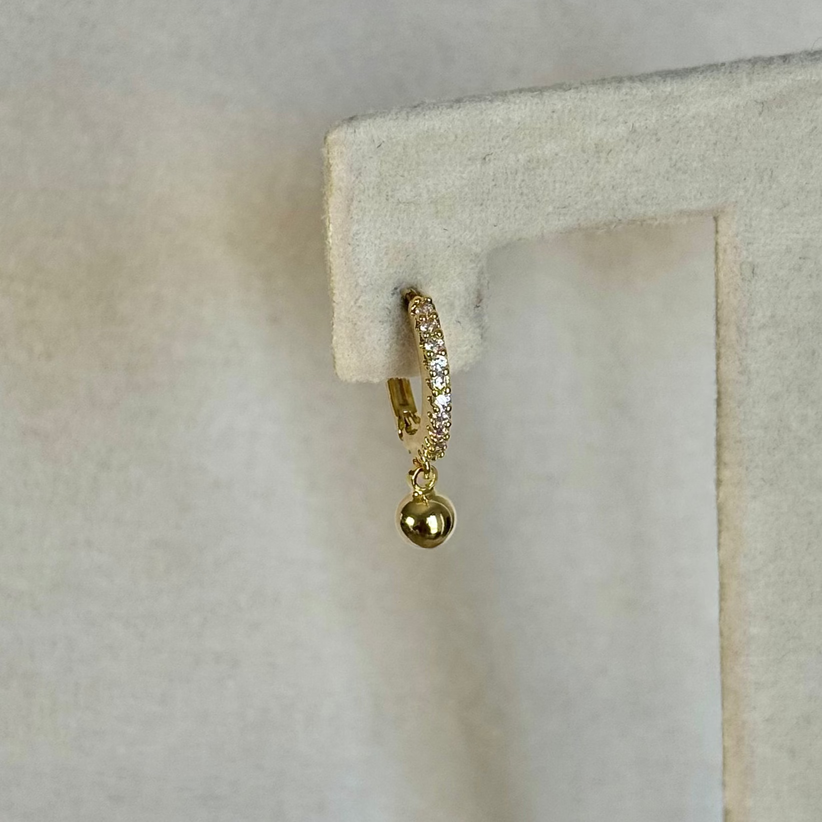 -Ring with click closure, with a zirconia throughout the ring, and with a small golden sphere hanging.
