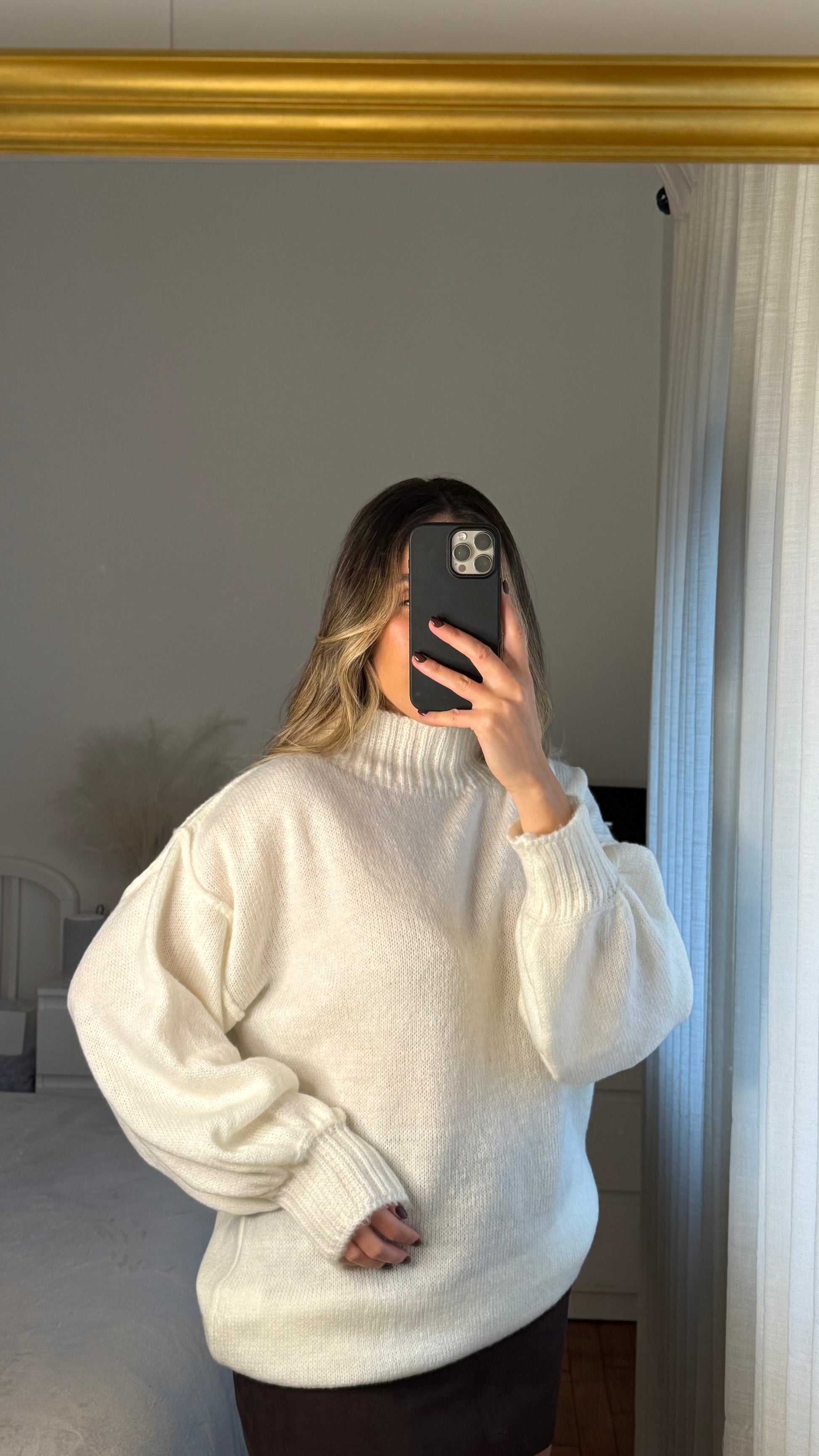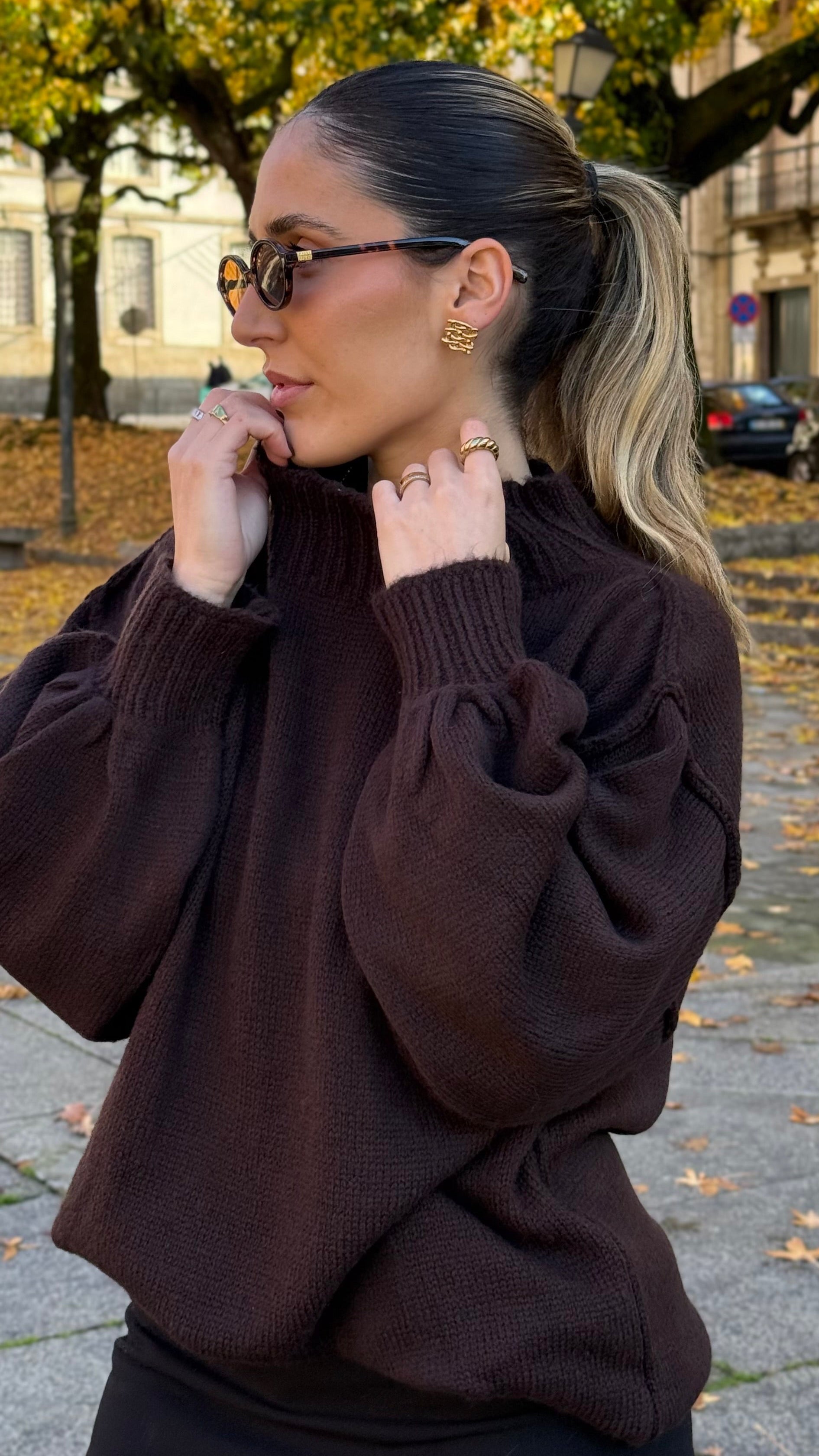 Camisola oversized em malha , com gola subida e mangas volumosas, num tom castanho profundo que dá um ar sofisticado e confortável.