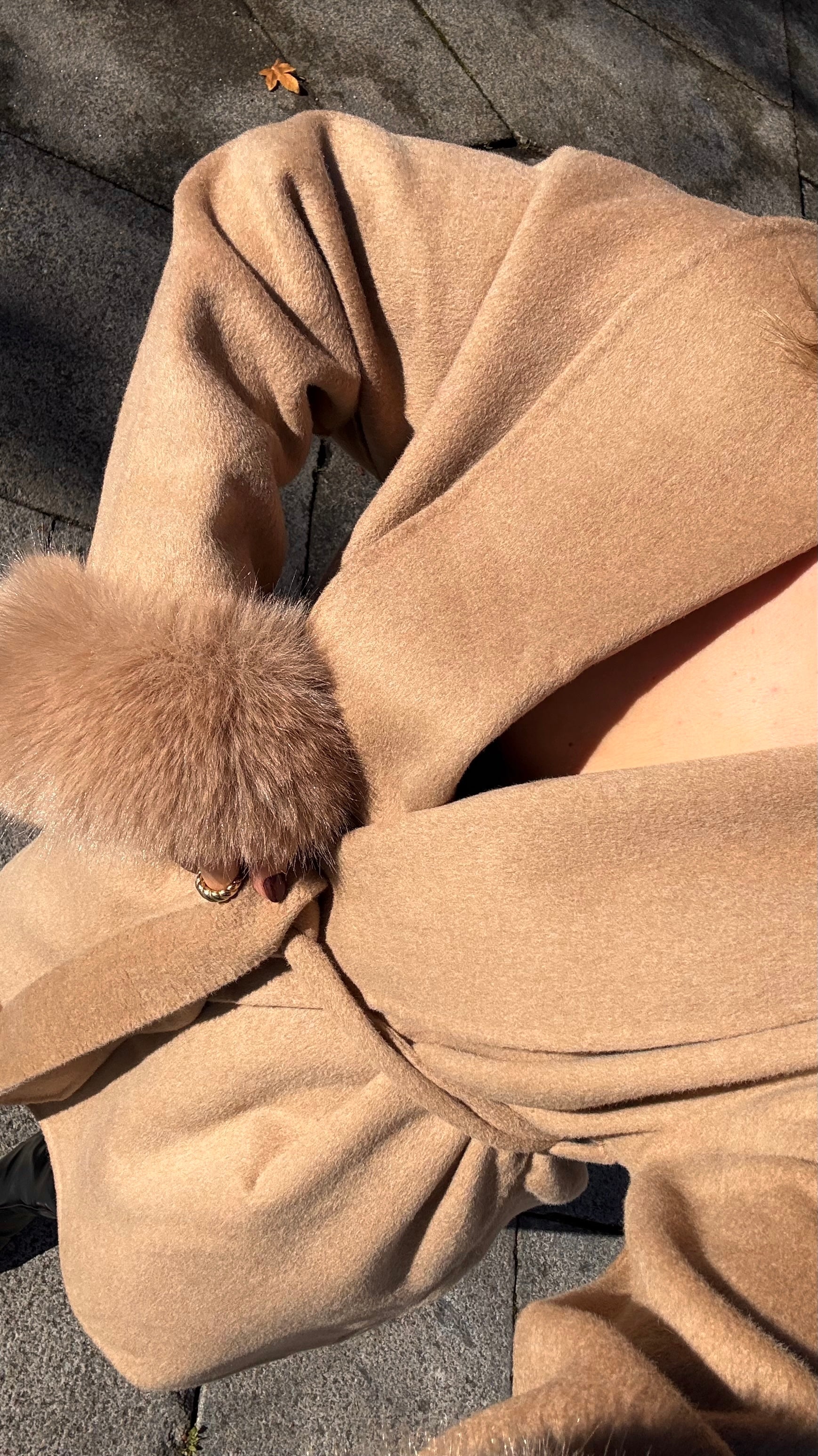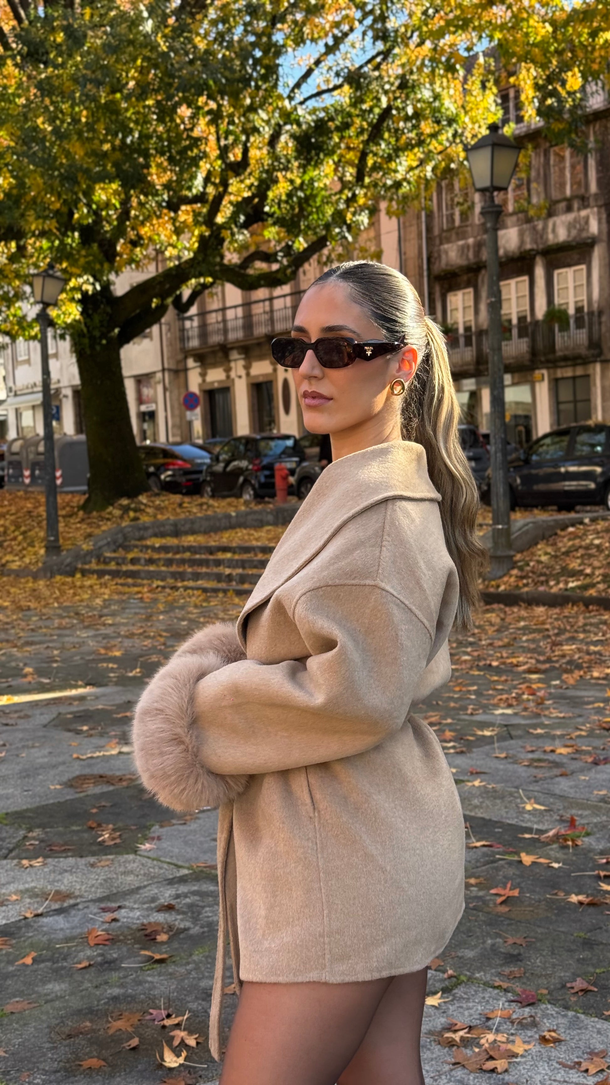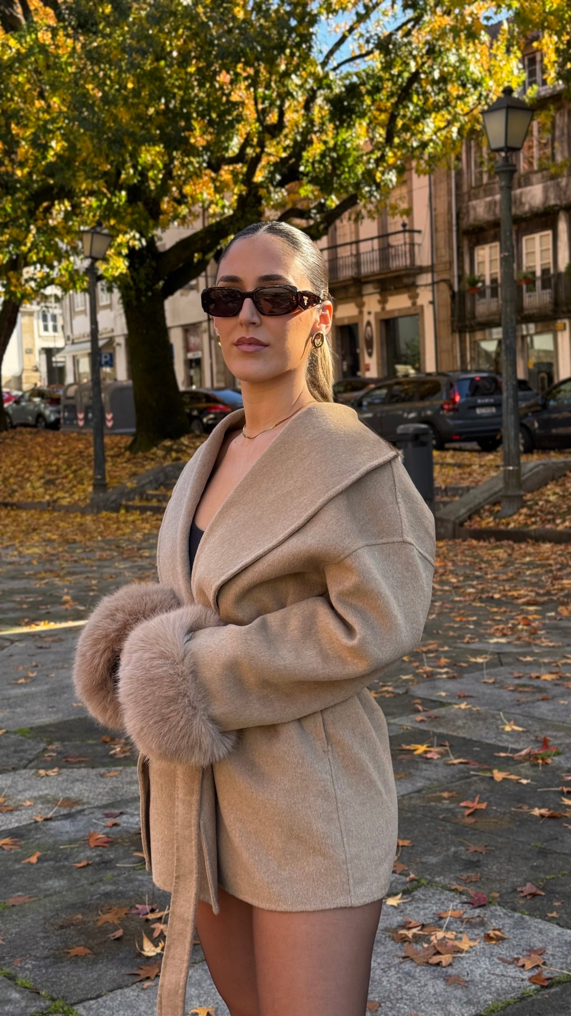Os punhos adornados com pelo macio elevam imediatamente a peça, criando um contraste perfeito entre textura, volume e luminosidade. O estilo é clássico, quente e ideal para looks de inverno, combinando charme e conforto.