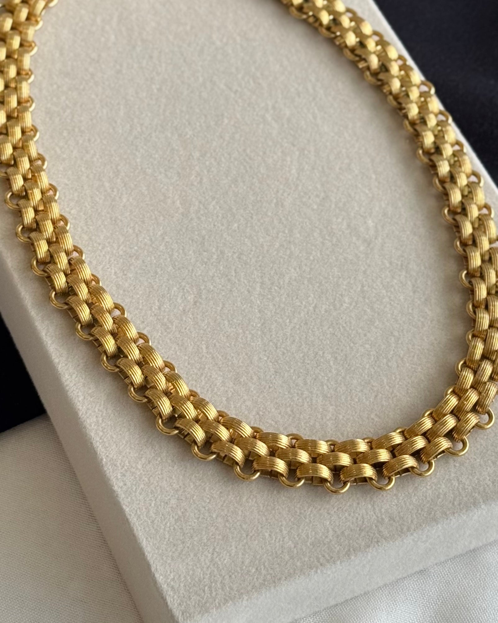-Necklace with a robust and intertwined design, composed of wide and rounded links in tone, formed in a thick and elegant mesh. The finish of the links is textured.