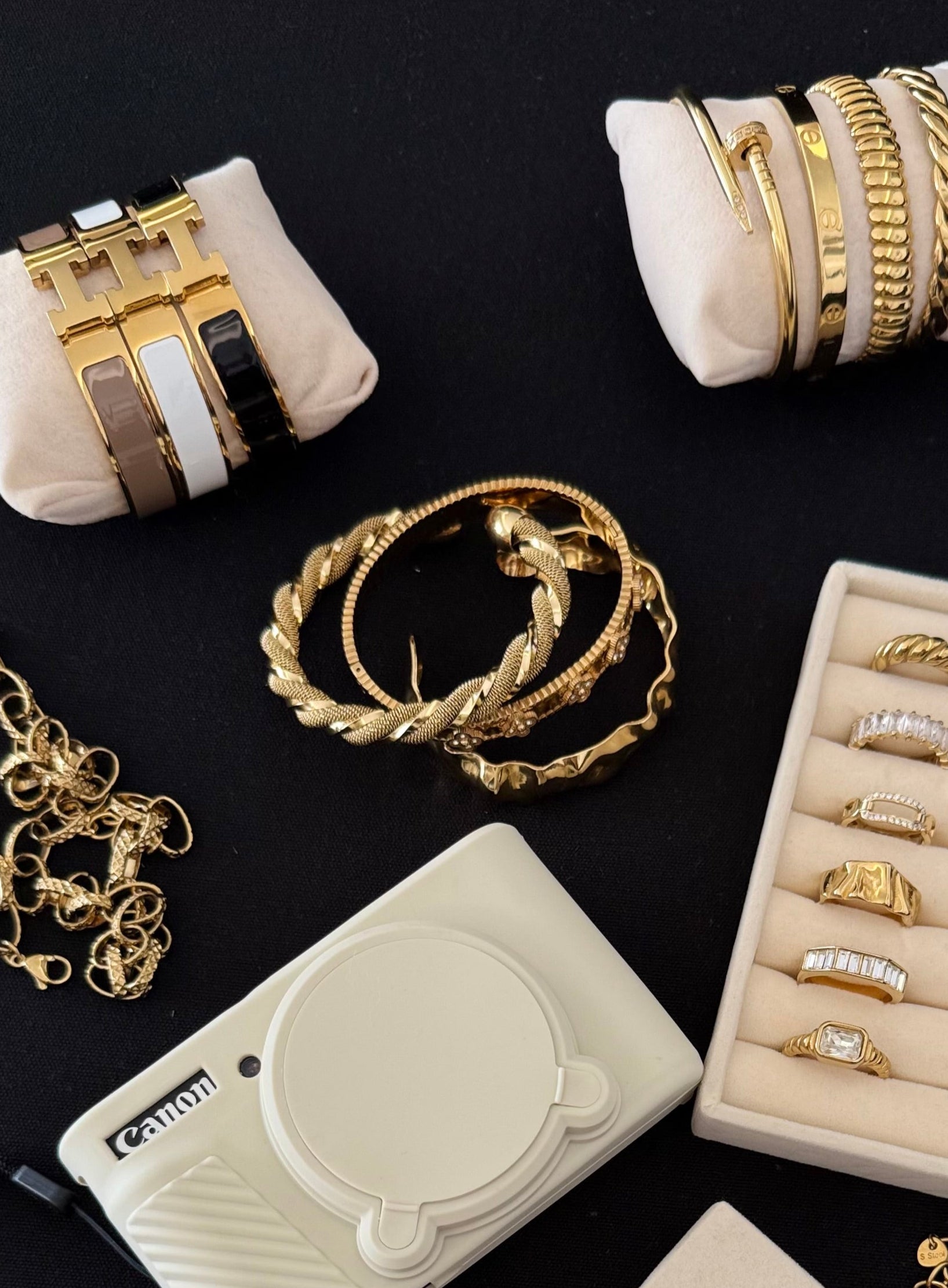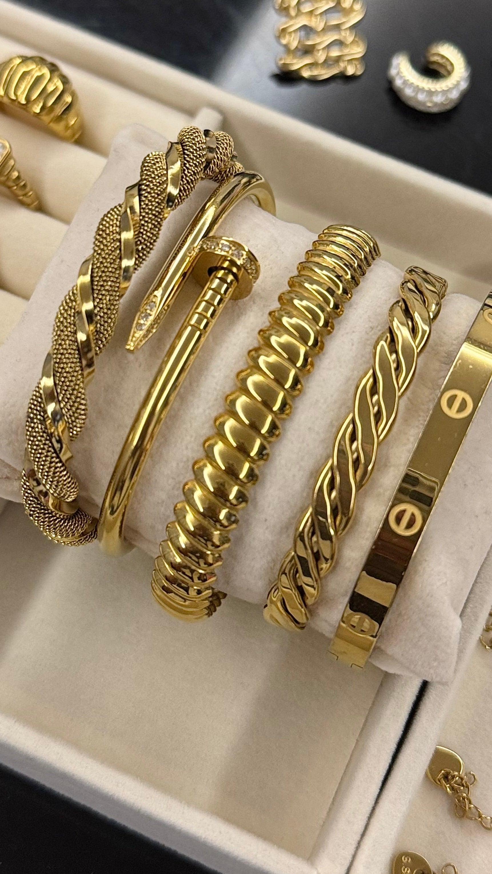 Bracelet made up of two intertwined pieces, one with a mesh-like texture and the other smooth, polished. The edges have a rounded finish.