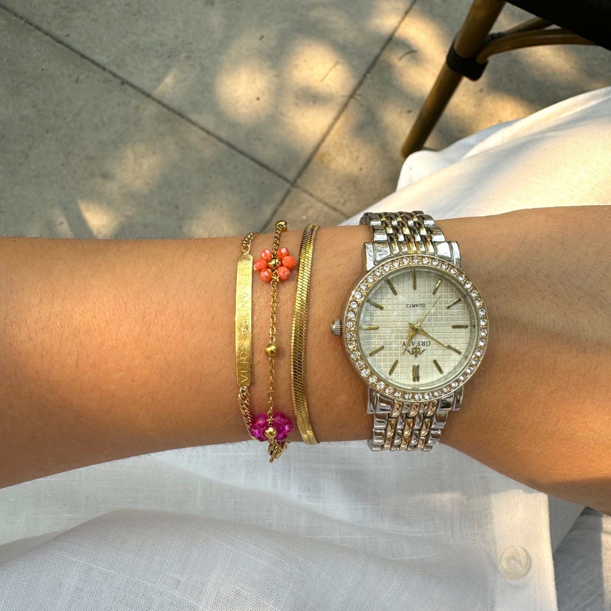 - Thin bracelet with flexible "snake" style mesh and glossy finish. Snap-on carabiner clasp with ring. Length 18 cm.