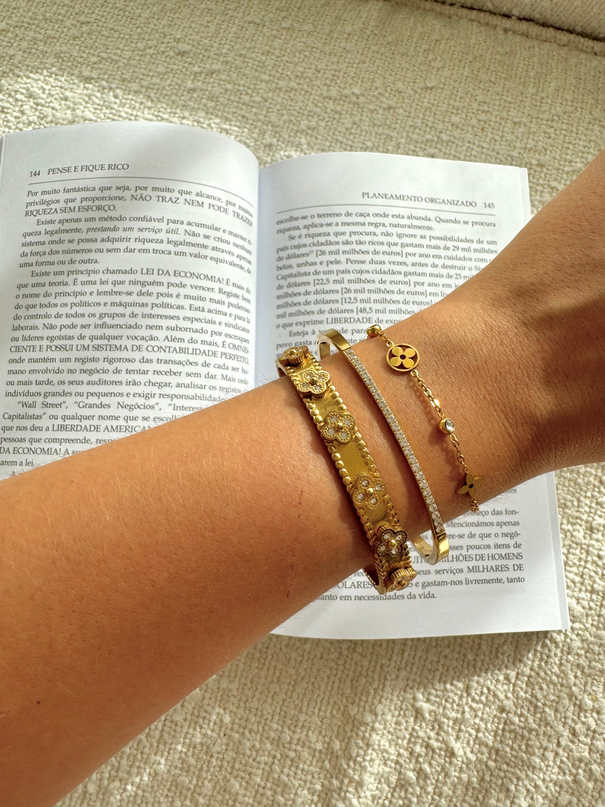 -Bracelet with floral details, clovers, with small shiny zirconias set in. Structure worked on the sides with a polished finish and snap closure.