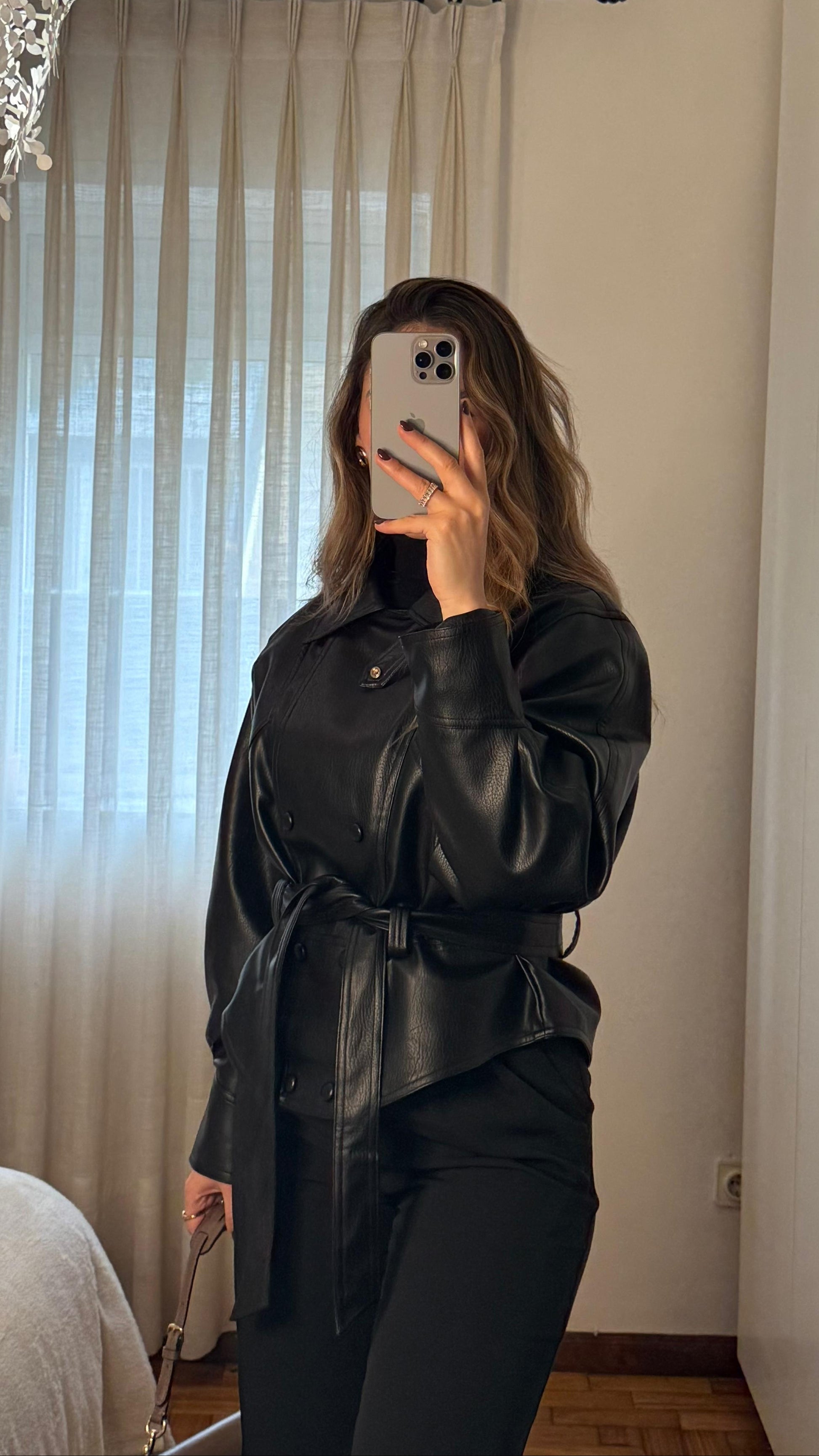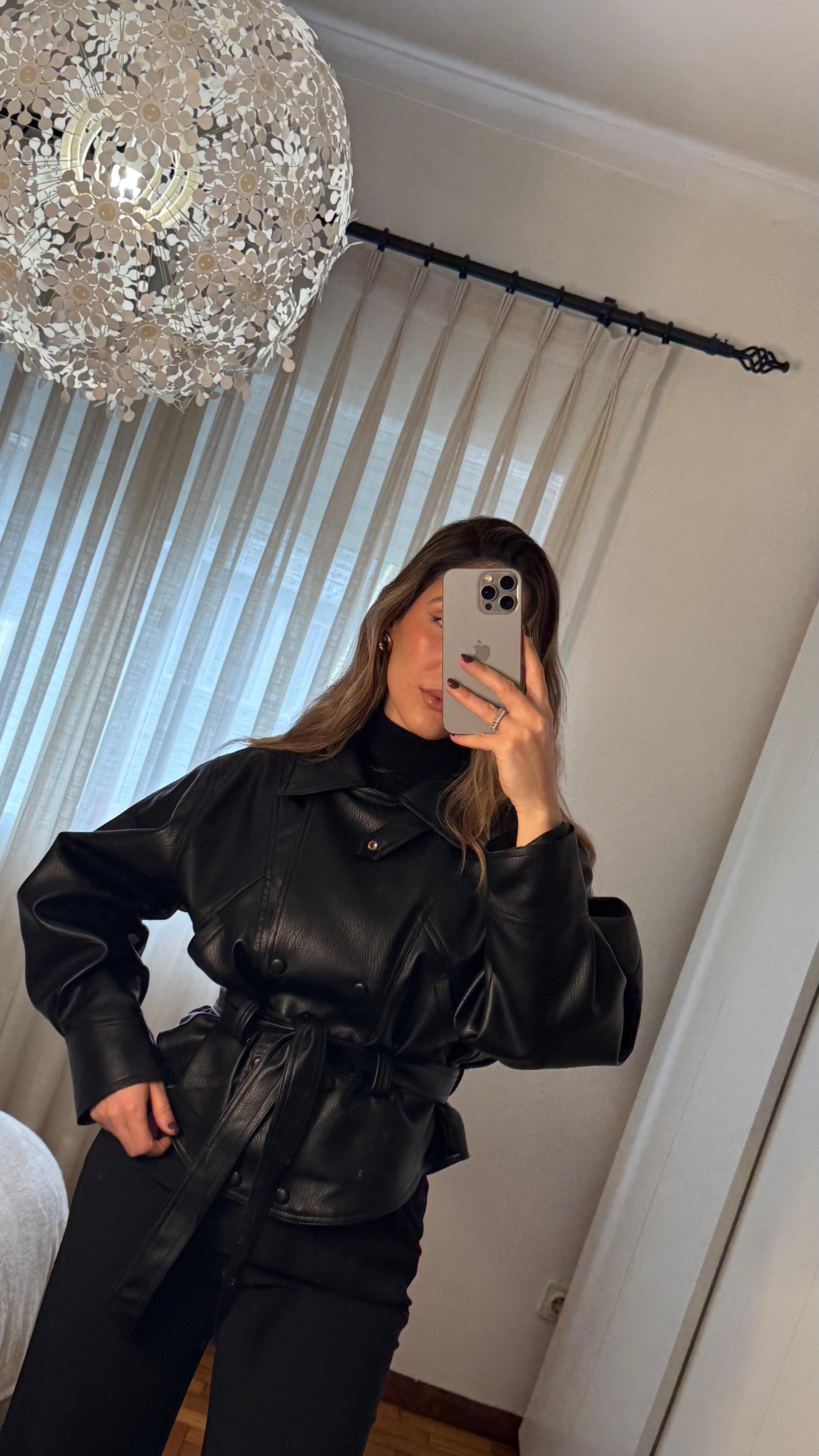 Casaco em pele sintética preta, de corte estruturado e cintura marcada, feito para fazer a diferença e marcar presença.